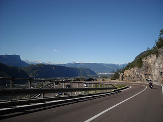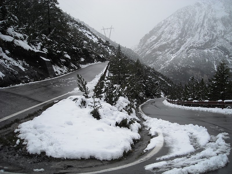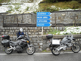 2ª Etapa: nos dirigimos al Stelvio a través del Petit San Bernardo y en las montañas se aprecian nubes muy oscuras, y como no empieza a llover, así que subimos el PSB entre lluvia y claros, por supuesto con mucha precaución, en el ascenso se nos une un grupo de alemanes que hacen la misma ruta y como no podría ser de otra forma aprovecho el ascenso para ir tirando fotos nuestras y de los alemanes, al llegar arriba se acerca Rainer y entabla conversación con nosotros, está interesado por las fotos, acabamos la charla con el correspondiente intercambio de e-mails, etc...